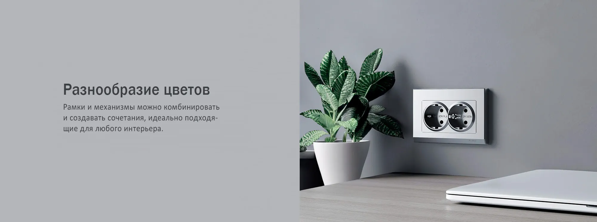 Современные цвета: серебряный матовый и графит матовый гармонично дополняют друг друга. Благодаря этому можно смело комбинировать рамки и механизмы или использовать весь остальной ассортимент Werkel, для создания неограниченного количества вариаций.